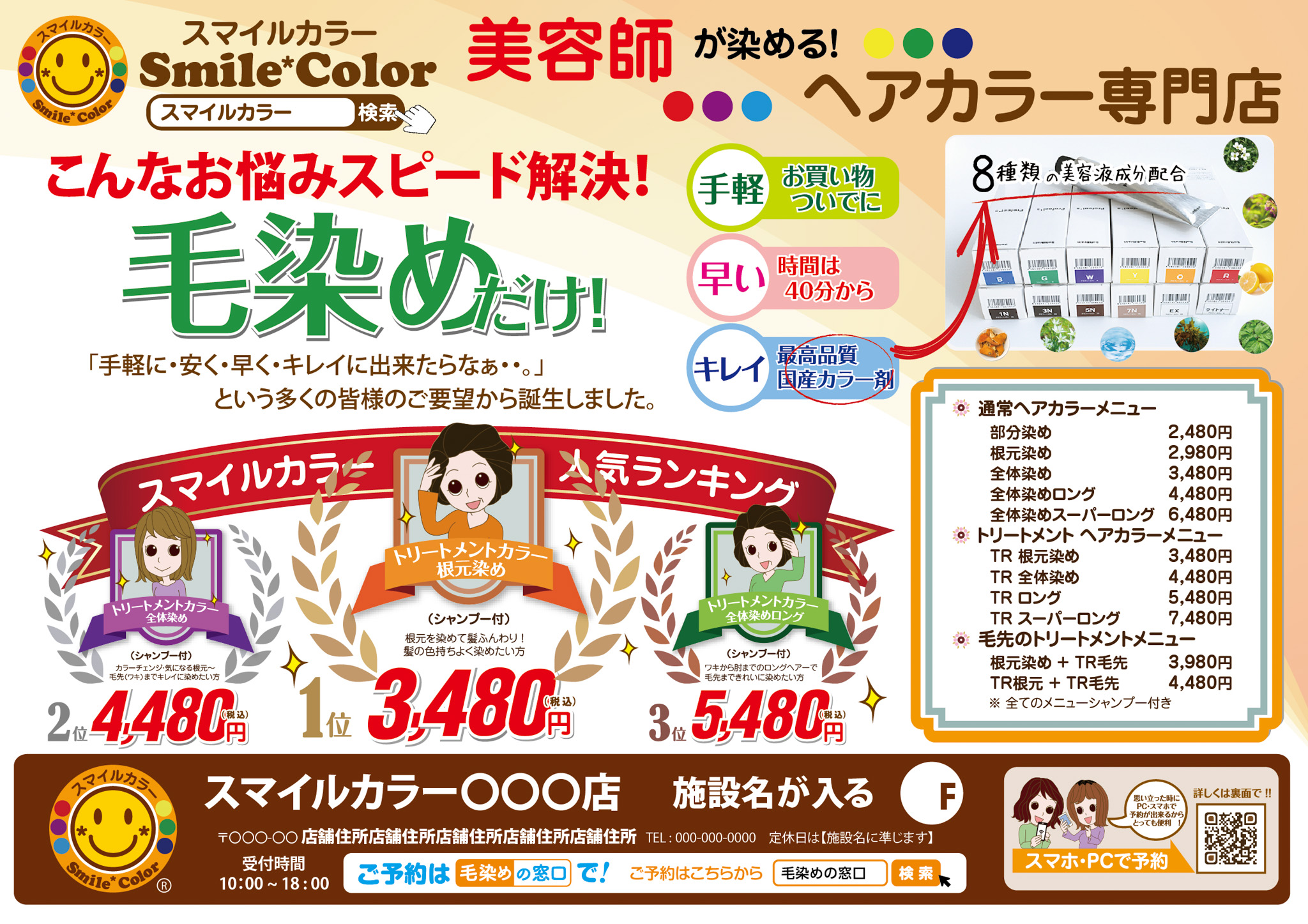 スマイルカラーFCサロン様が新規獲得向けに配布するA5サイズのチラシです。